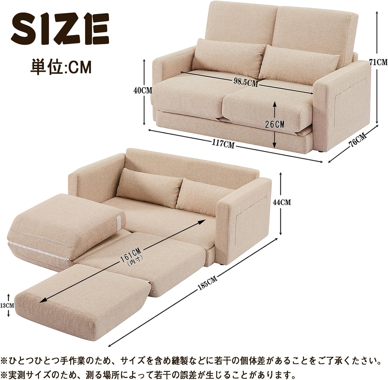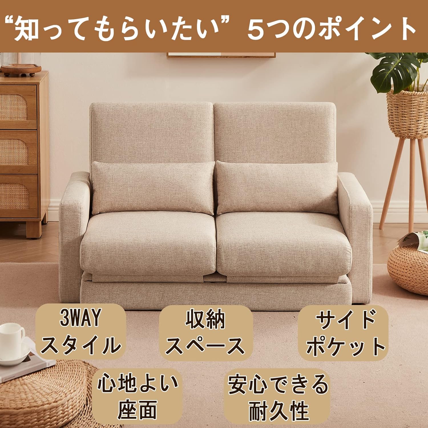 2人掛け 収納付き ローソファー ベッド 折りたたみ カウチソファー 一人用 コンパクト フロアソファー 一人暮らし ファブリック ひじ掛け付き お洒落 ダブル(ベージュ・2人掛け)