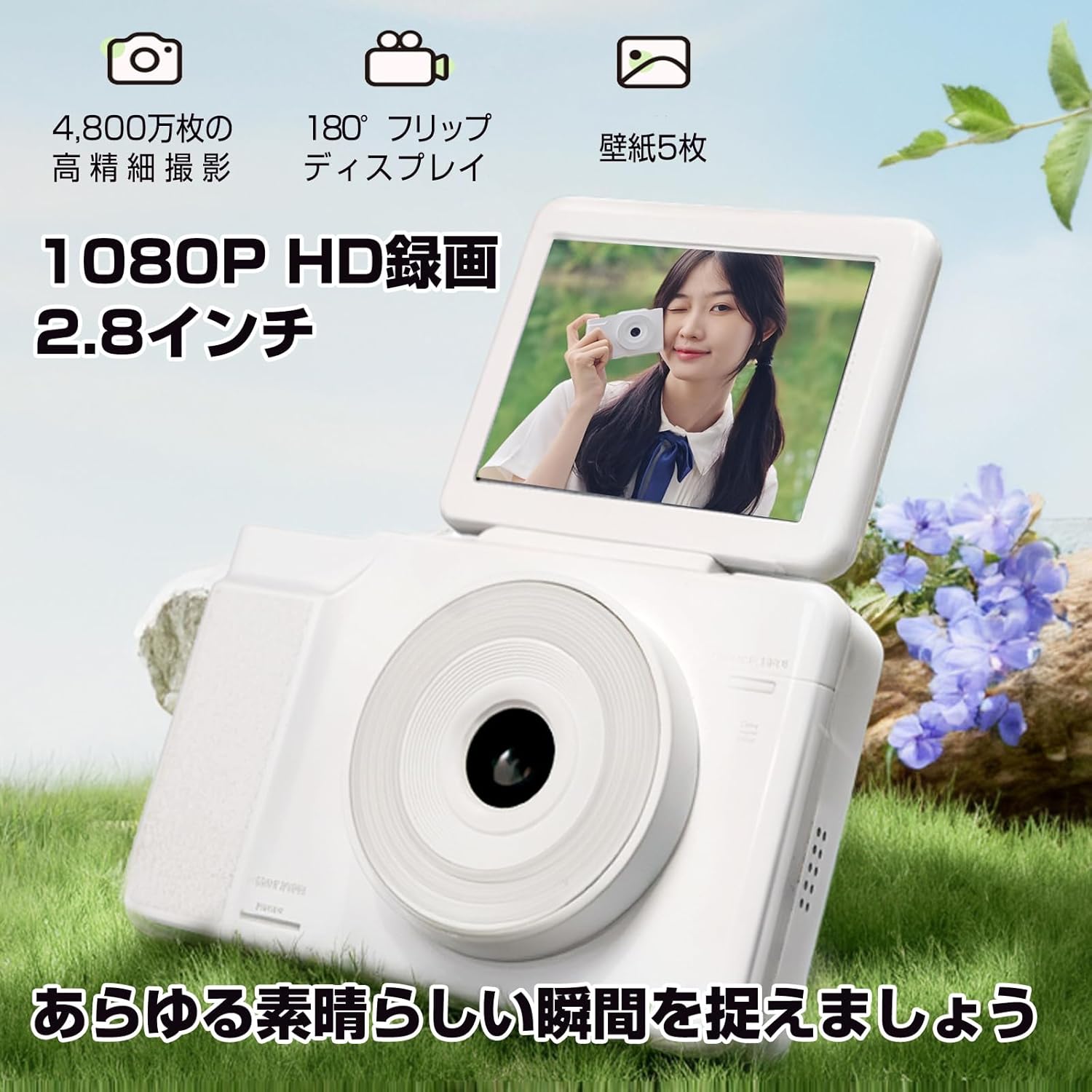 2.8インチ液晶、16倍デジタルズーム、1080P動画撮影、32GB Micro SDカード付属、完璧な自撮り用のフリップトップデザイン