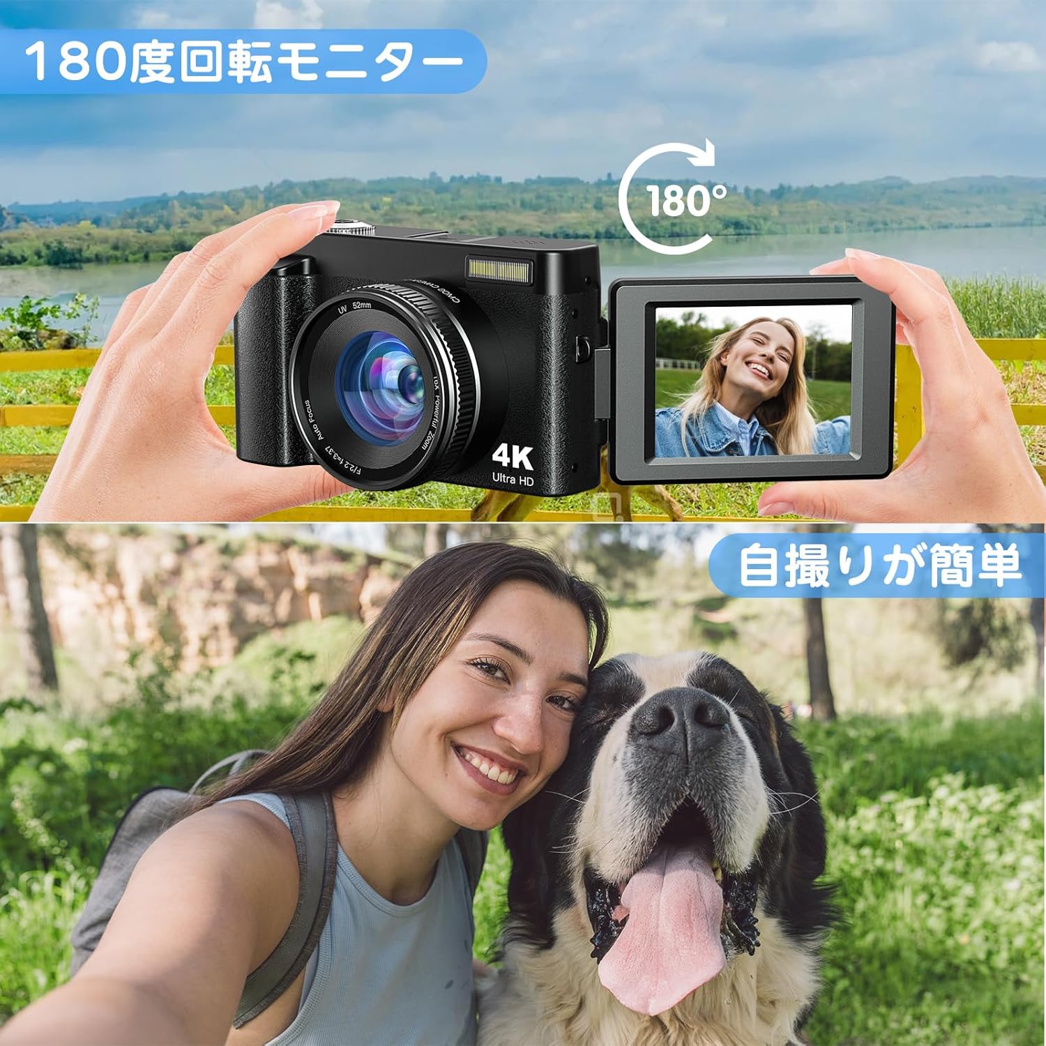4K 4800万画素 デジタルカメラ 180度回転スクリーン 自撮り便利 16倍デジタルズーム 手振れ補正 オートフォーカス 3インチ大画面 コンパクト ウェブカメラ 旅行 修学旅行 初心者カメラ 予備バッテリー付き 32Gメモリカード 黒