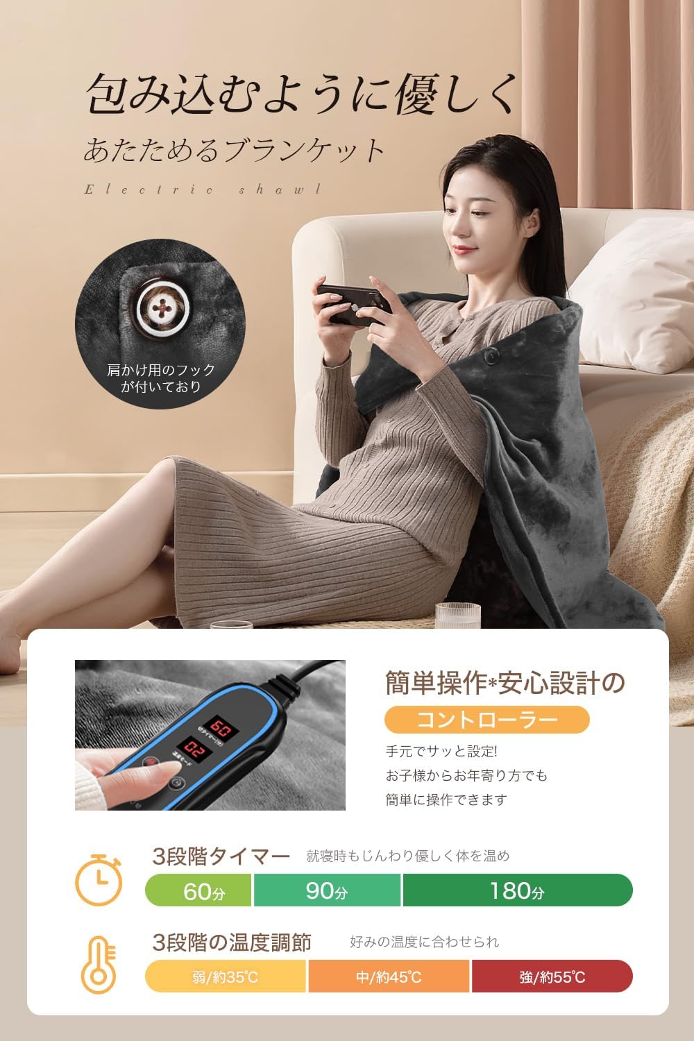 電気ブランケット usb 膝掛け 3段階温度調節 タイマー機能 自動オフ 消し忘れ防止 速暖 大判 ヒーター付きブランケット 電気ひざ掛け 肩掛け 暖かい 省エネ 洗える usb電気毛布 キャンプ 車内泊 オフィス アウトドア 暖房器具