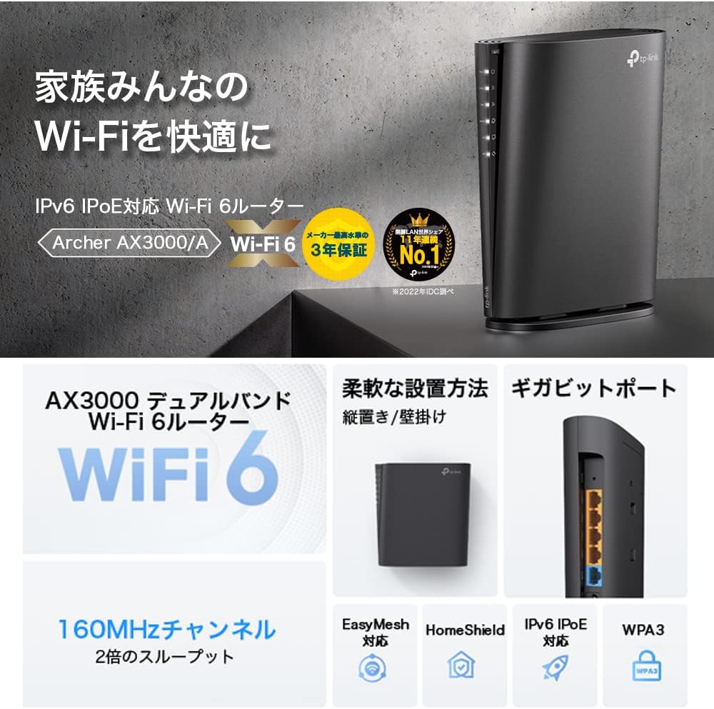 2402 + 574 Mbps HE160 EasyMesh/OneMesh 対応 縦型 TP-Link Archer AX3000/A