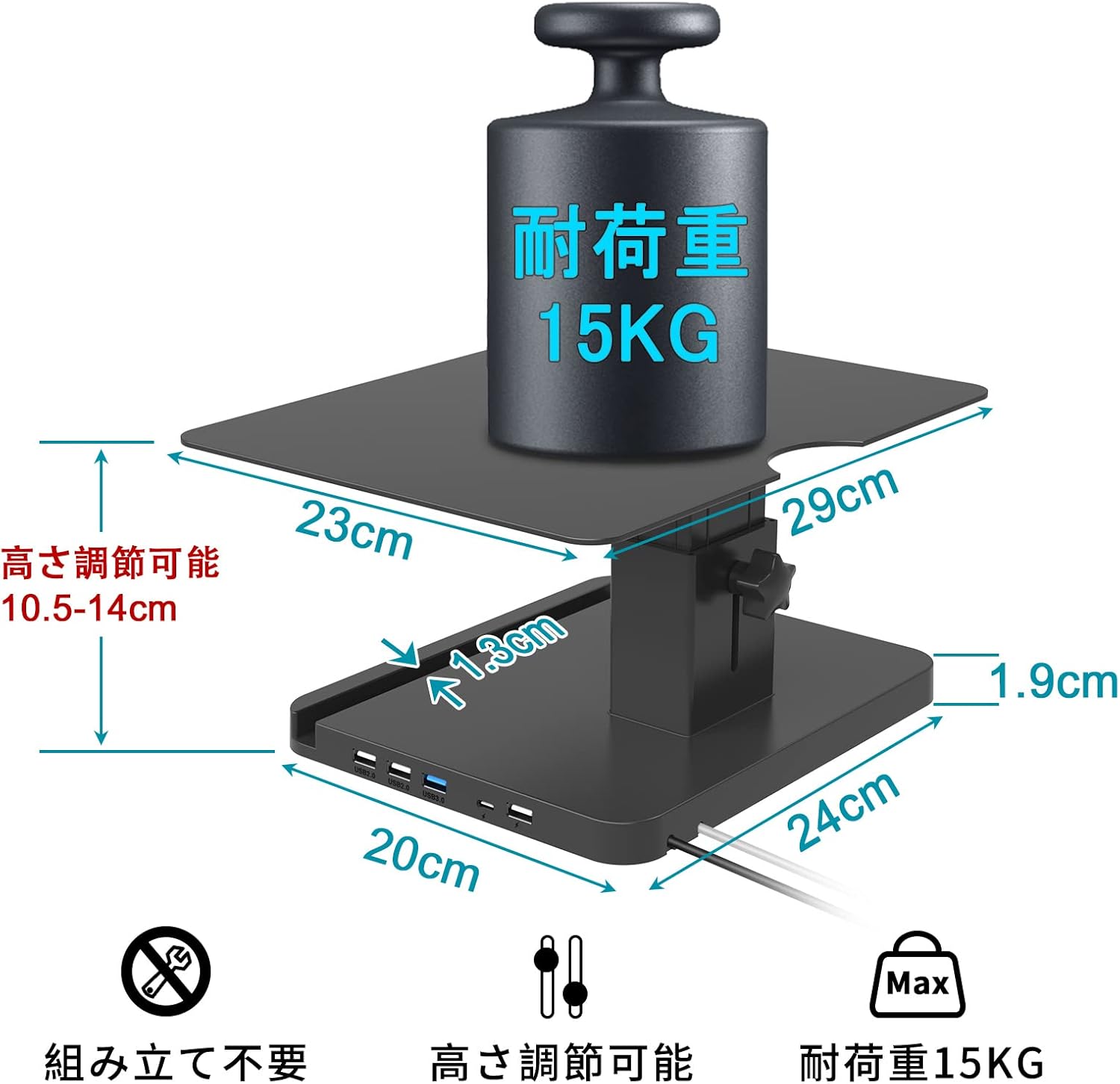 高さ調整 机上台 USB HUBと充電器付き 金属製ディスプレイ 台 ノートパソコン、PC、iMac