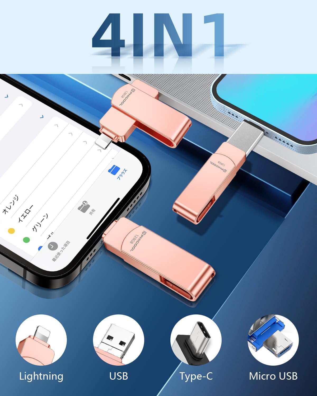 IOS/Android/PC USB高速 4 in1 Phone usbメモリ スマホ usbメモリphone バックアップ usbメモリ タイプc usbメモリ 外付けusbメモリー 容量不足解消写真沢山撮る人に必要なusbメモリ! (ピンク, アプリ不要 128GB)