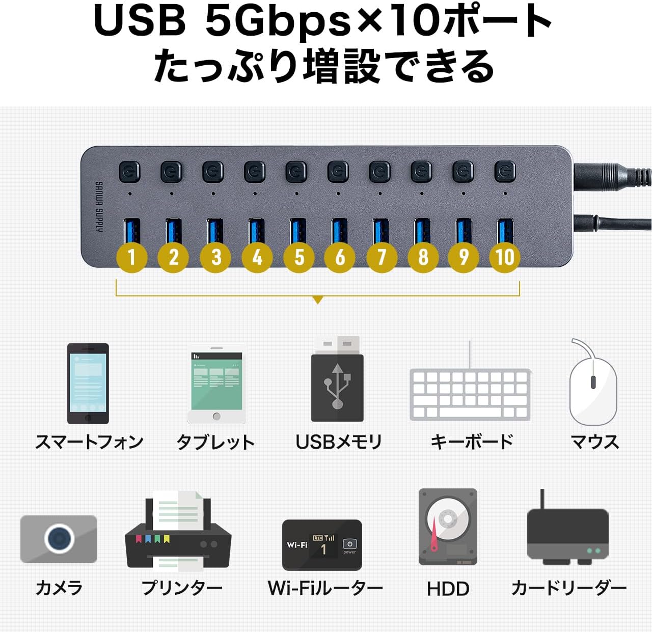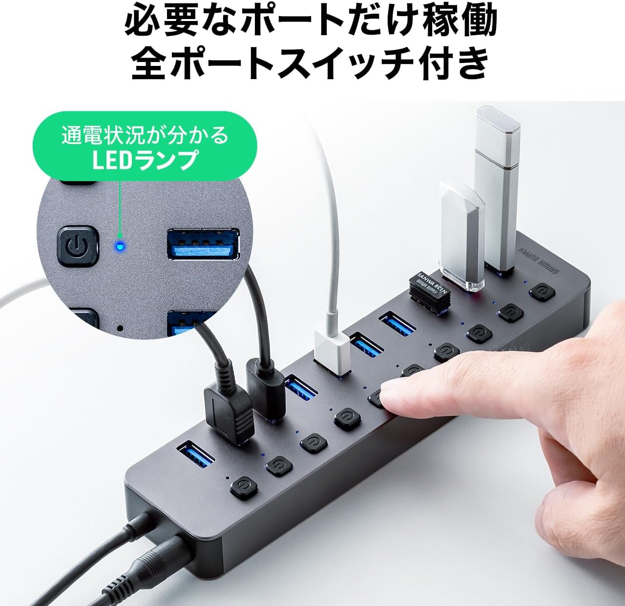 セルフパワー USB充電器 個別スイッチ付 USB3.2/5Gbps ACアダプタ付 400-HUBA23GM