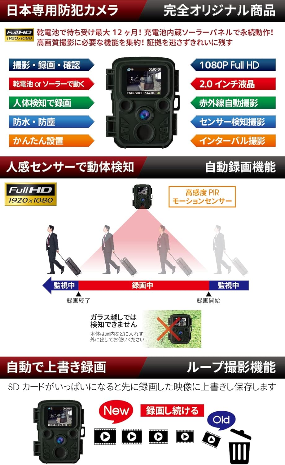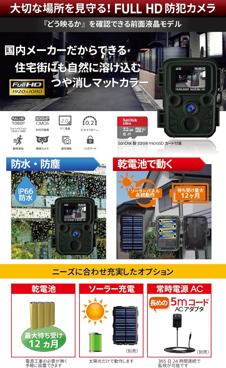 小型 屋外 防水 防塵 IP66対応 1080p対応 モーションのみ 赤外線LED 監視カメラ 動体検知 人感センサー 夜間対応 電池式 自動上書き録画 日本語説明書 国内メーカー品 迷彩 カモフラージュ 屋外 屋内 両用