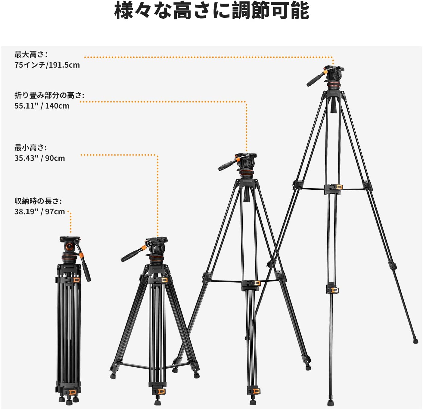 ConceptK&F Concept 75"/191cm ビデオ三脚、フルード雲台付き