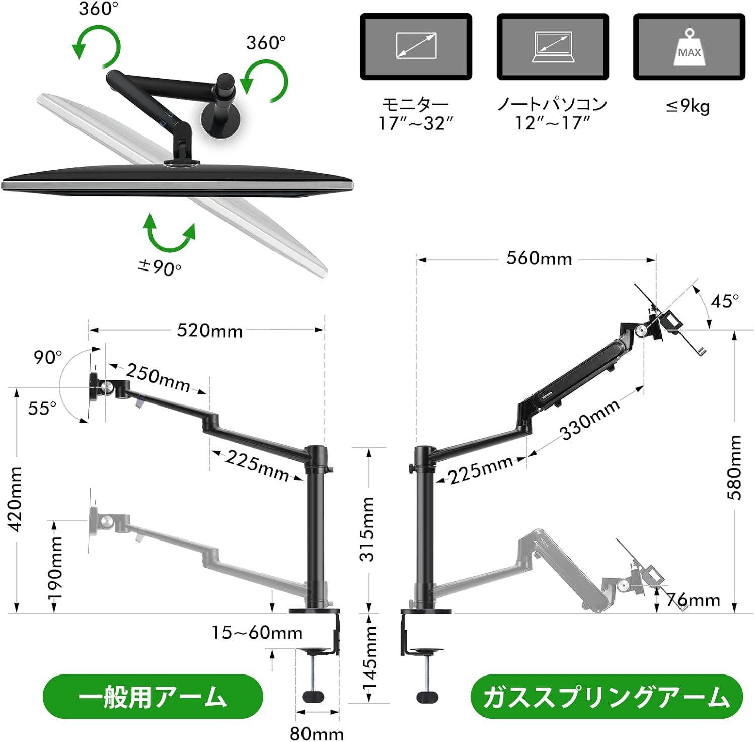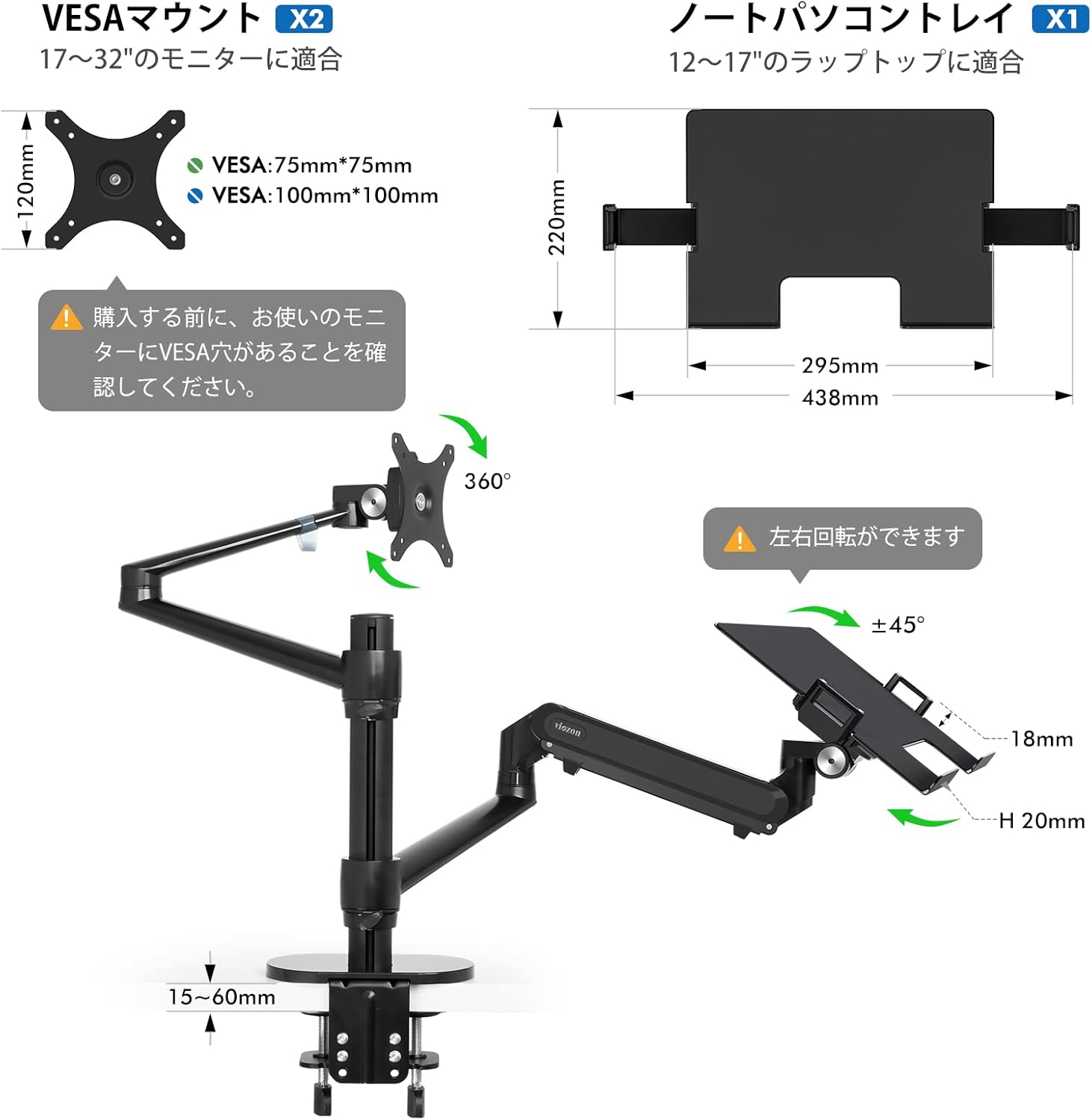 2-in-1調整可能デュアルモニターアーム デスクスタンド、ラップトップトレイ付き