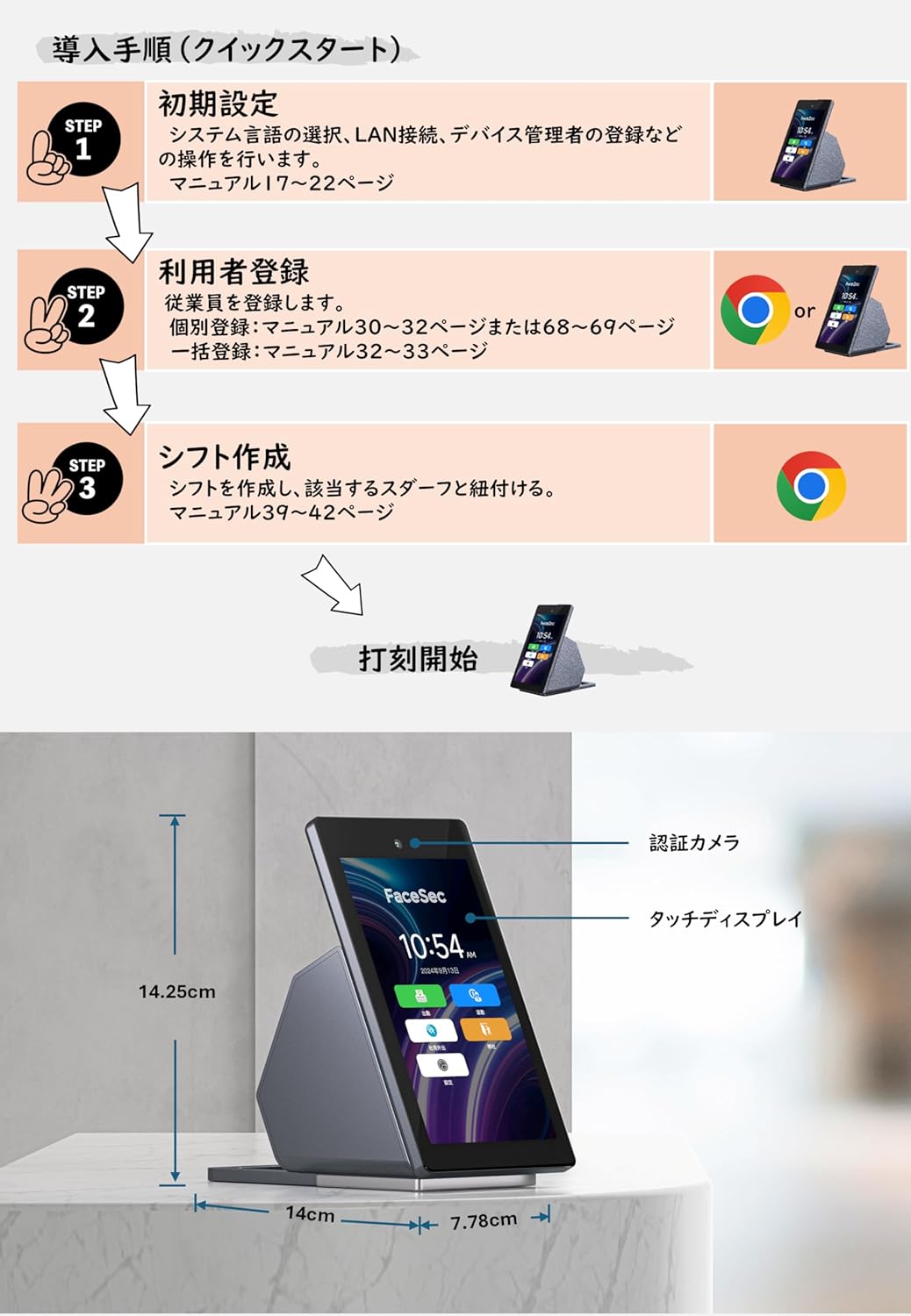 高速・高精度AI顔認証 ALL-IN-ONEスマート勤怠管理システム | ランニングコストなし | 最大2万人登録・20万件打刻保存 | シフト作成 無制限 | 打刻タイプ:出退勤、外出帰社、休憩 | 自動集計 | 勤務レポートを即時可視化、エクスポート、メール配信 | 不正打刻防止 (FAD-D55)