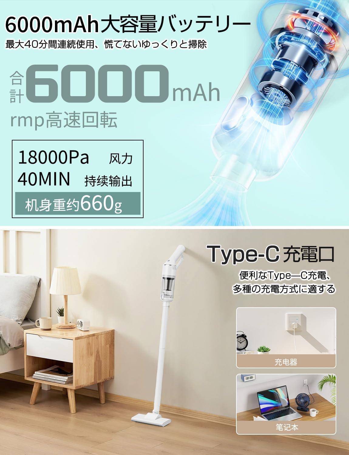 18000pa強力吸引 5種類ノズル HEPAフィルター Type-C充電式