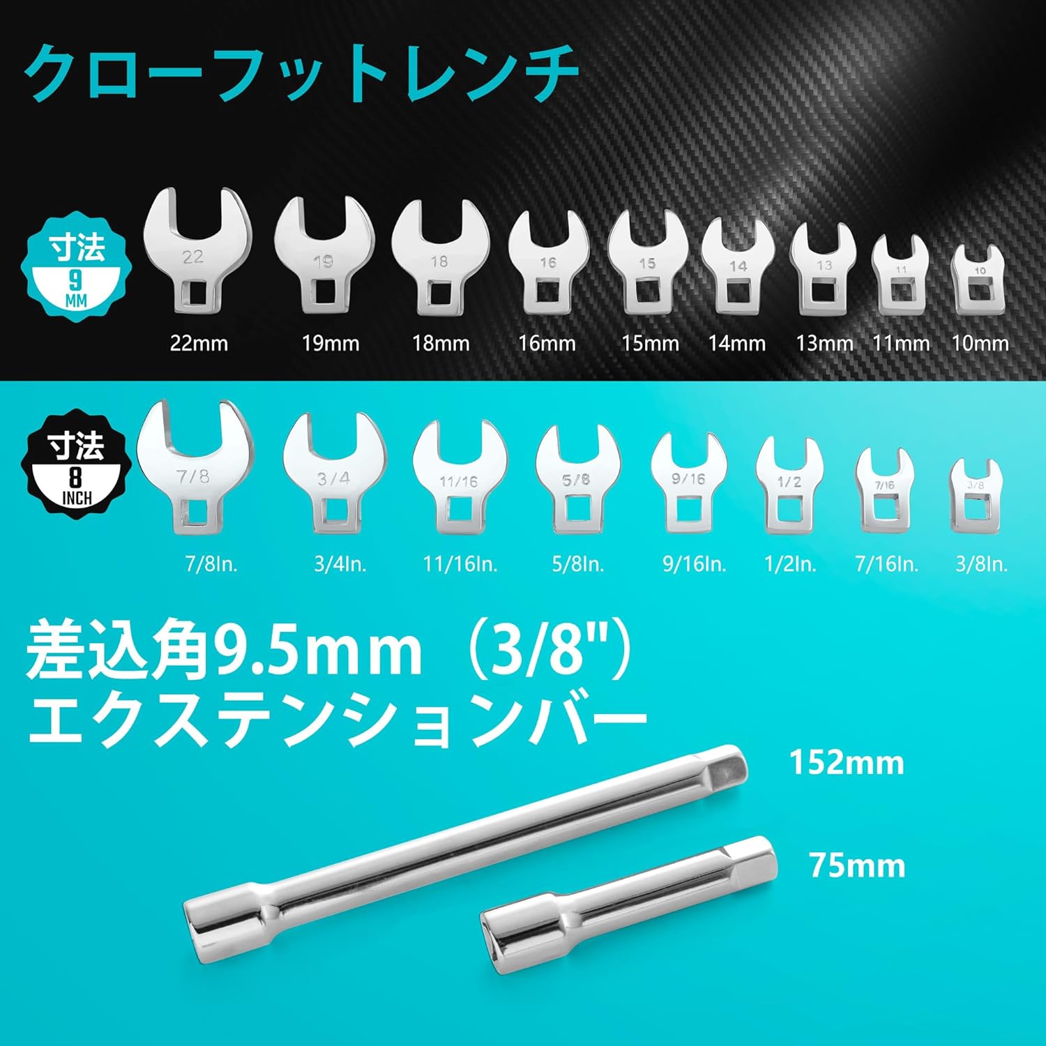 フレアナットレンチセット 19点組 メートル製&SAE製 差込角9.5mm