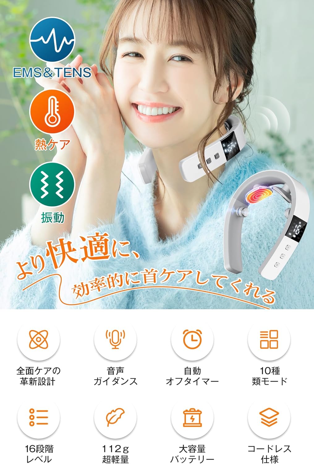 理学療法士監修 (加温×振動×EMS&TENSのW効果) LED液晶ディスプレイ 10種類のモード 16段階の強度調整 軽量 USB充電式 コードレス