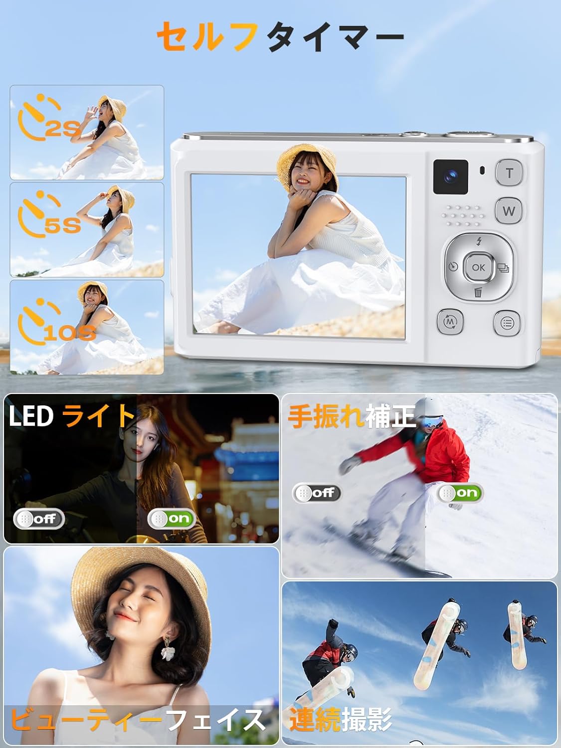 デジカメ デュアルカメラ 32GBMicro SDカード付属 長いストラップ付き 4800万画素 UHD4K録画 16倍デジタルズーム 2.8インチスクリーン ビデオ録画 ウェブカメラ 多機能カメラ リアカメラ フロントカメラ 持ち運びに便利 軽量 小型 コンパクト(ホワイト)