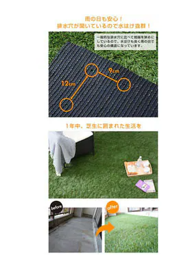 芝生の裏面には水抜き穴付きで水はけ抜群。敷きたい場所に合わせてカッターやはさみで自由自在にカット可能。
