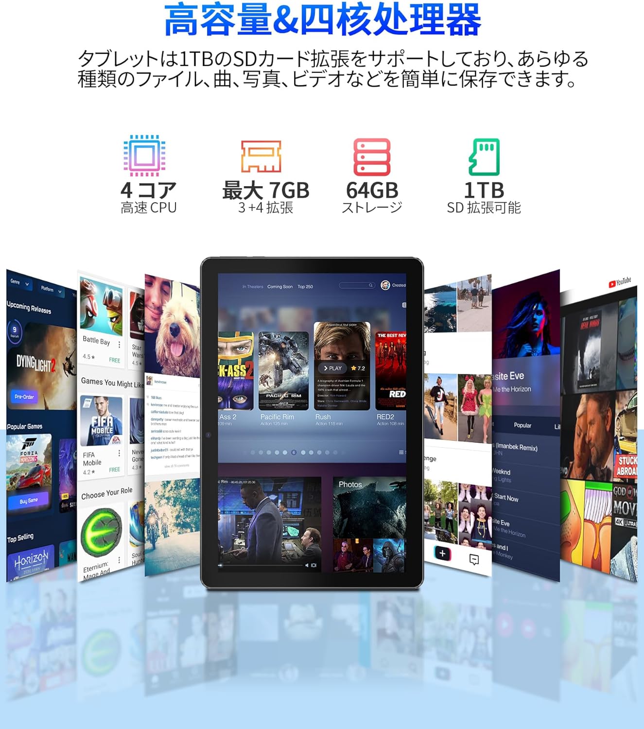 wi-fiモデル、Android 13 タブレット 10インチ 7GB+64GB+1TB拡張、6000mAhバッテリー、4コアCPU