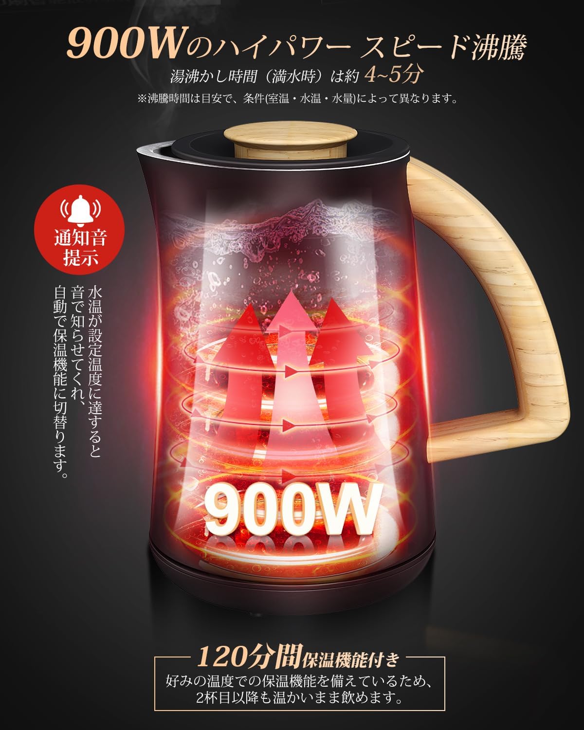 デジタルディスプレイ 2時間保温 900W 二重構造 触れても熱くない 急速沸騰 空焚き防止機能