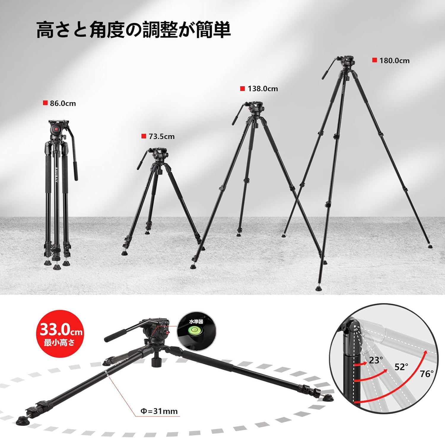 RAUBAY 180cm ビデオカメラ三脚