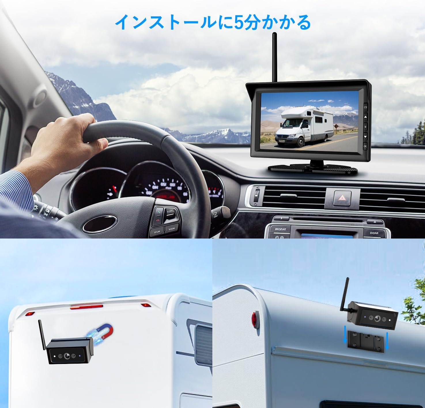 強力磁気 無線 バックカメラ 7インチバックカメラモニターセット バックカメラソーラー