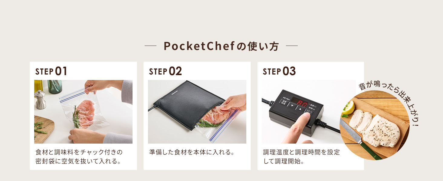 火も水もいらない!新しいカタチの低温調理器 PocketChef。