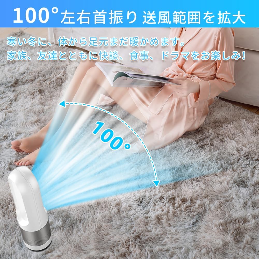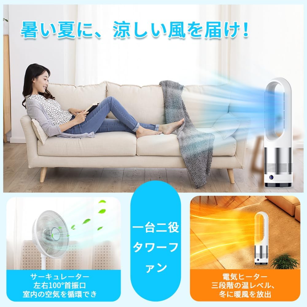 スリム扇風機 3段階暖風・8段階冷風切り替え 100°左右首振り 1-9Hタイマー設定可 転倒自動OFF 過熱保護 リモコン付き 省エネ 軽量 持ち運び便利 部屋 洗面所 脱衣所適用 セラミックヒーター 電気ファンヒーター