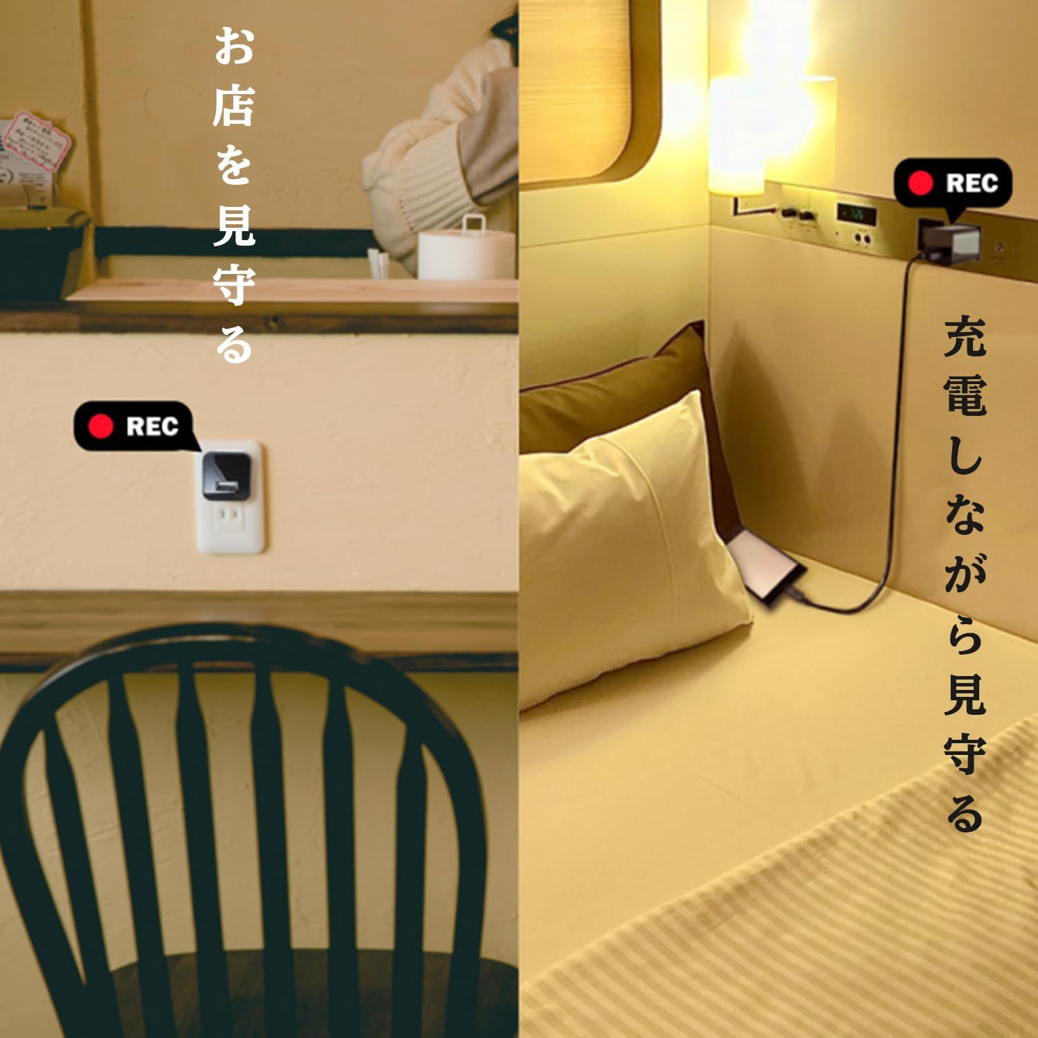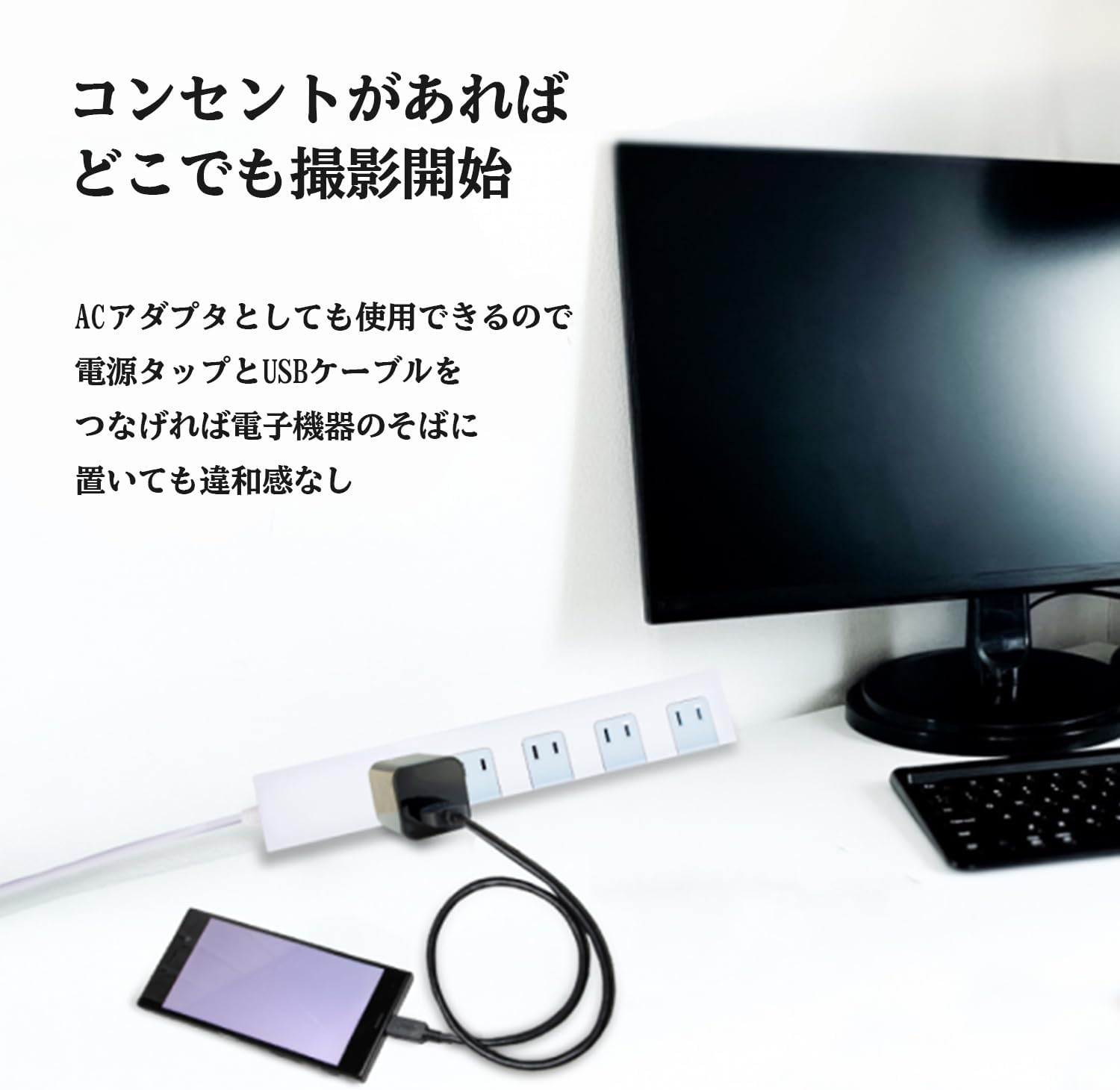 カメラは音や光を発しません、USBアダプターとして、各種のスマートフォンのコンセント充電が使用できます