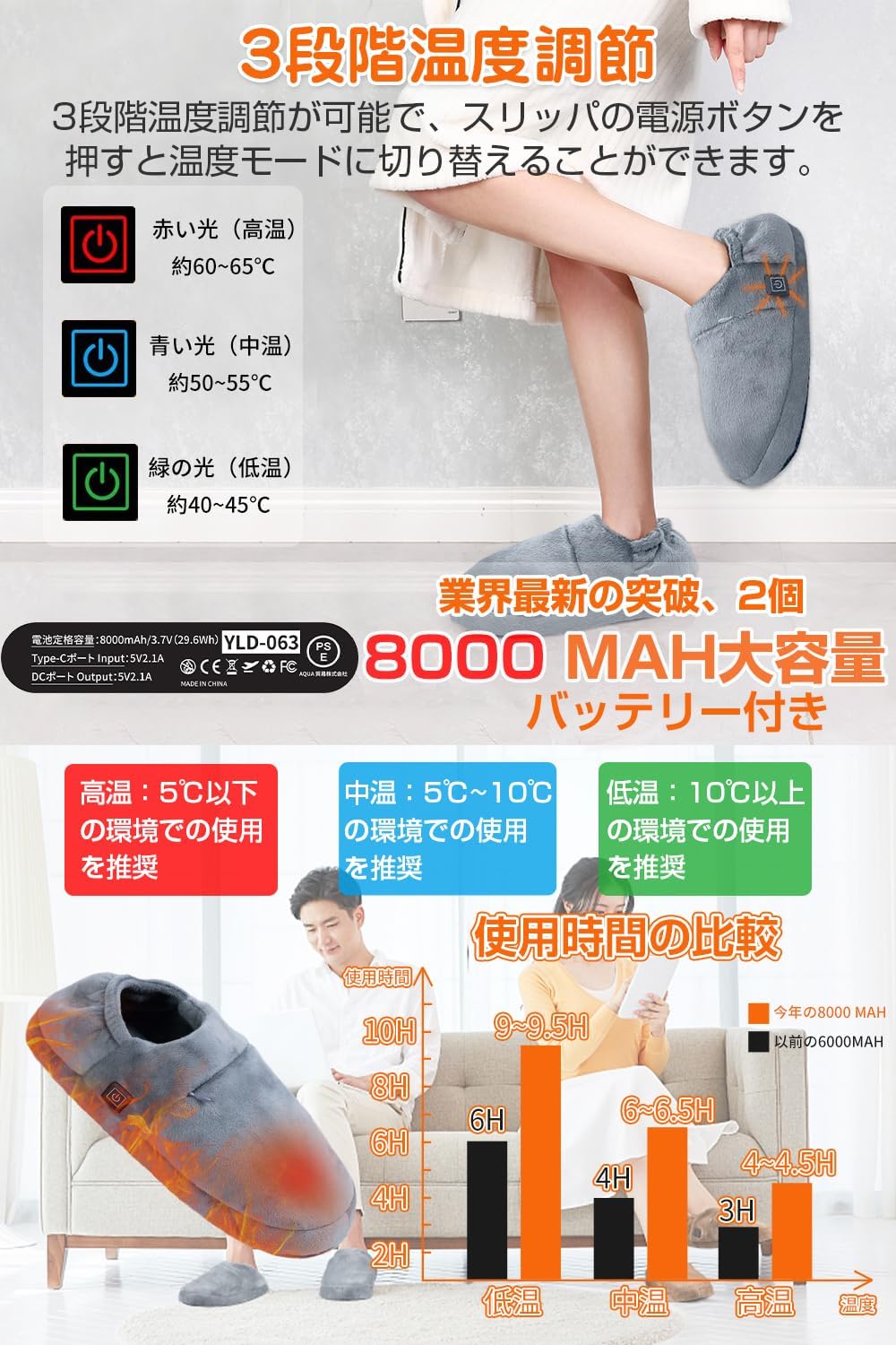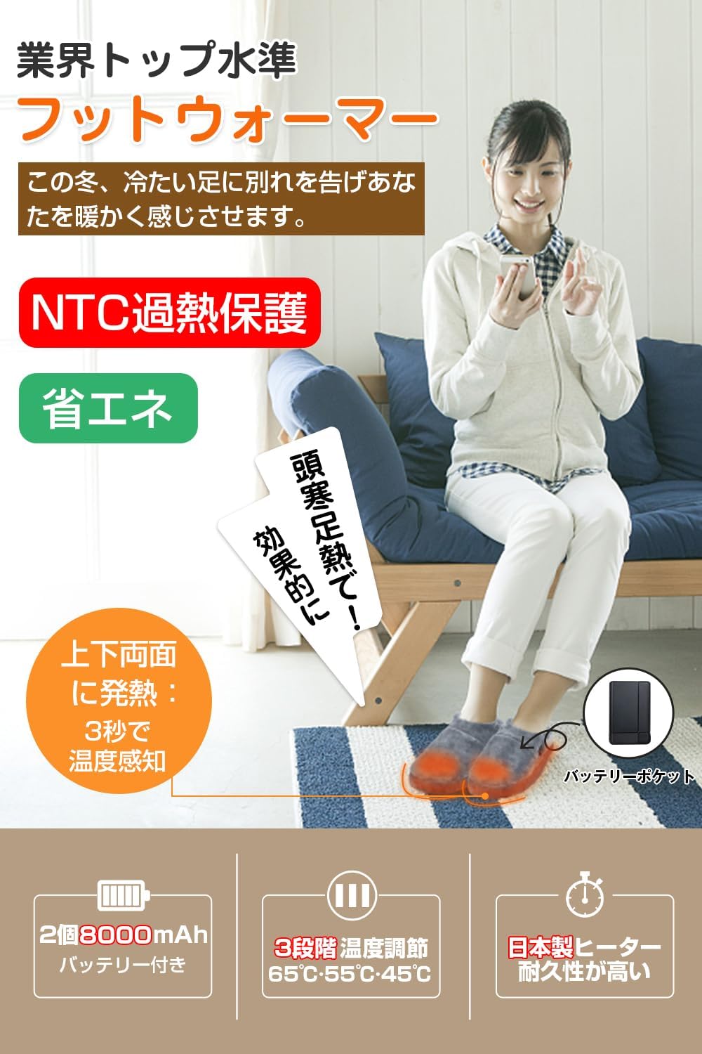 NTC過熱保護 30秒で速熱 自由に歩ける 3段階温度調節 電気足温器 防寒対策 室内履き