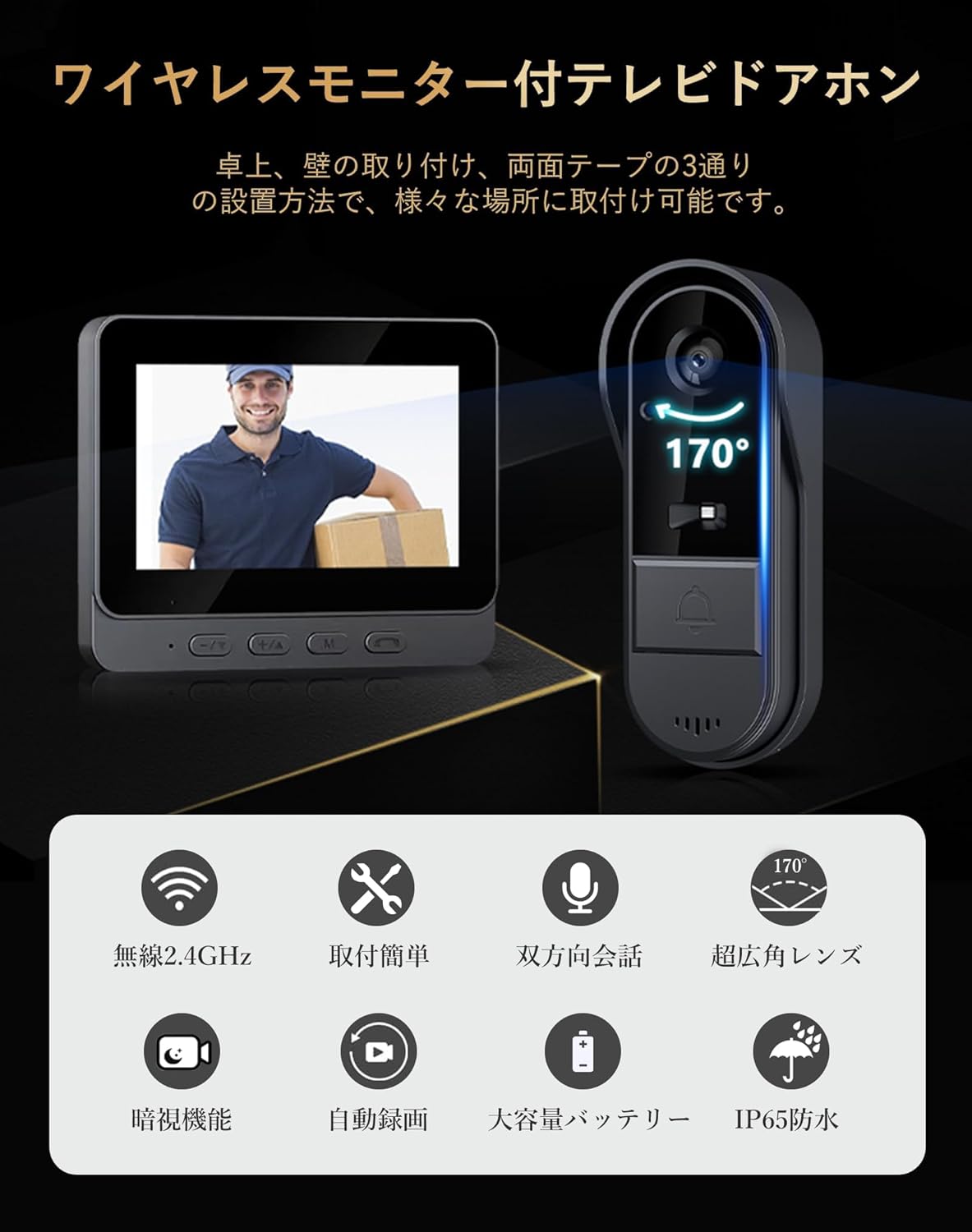ドアホン ワイヤレス 2.4GHz無線 玄関チャイム IP65防水 屋外