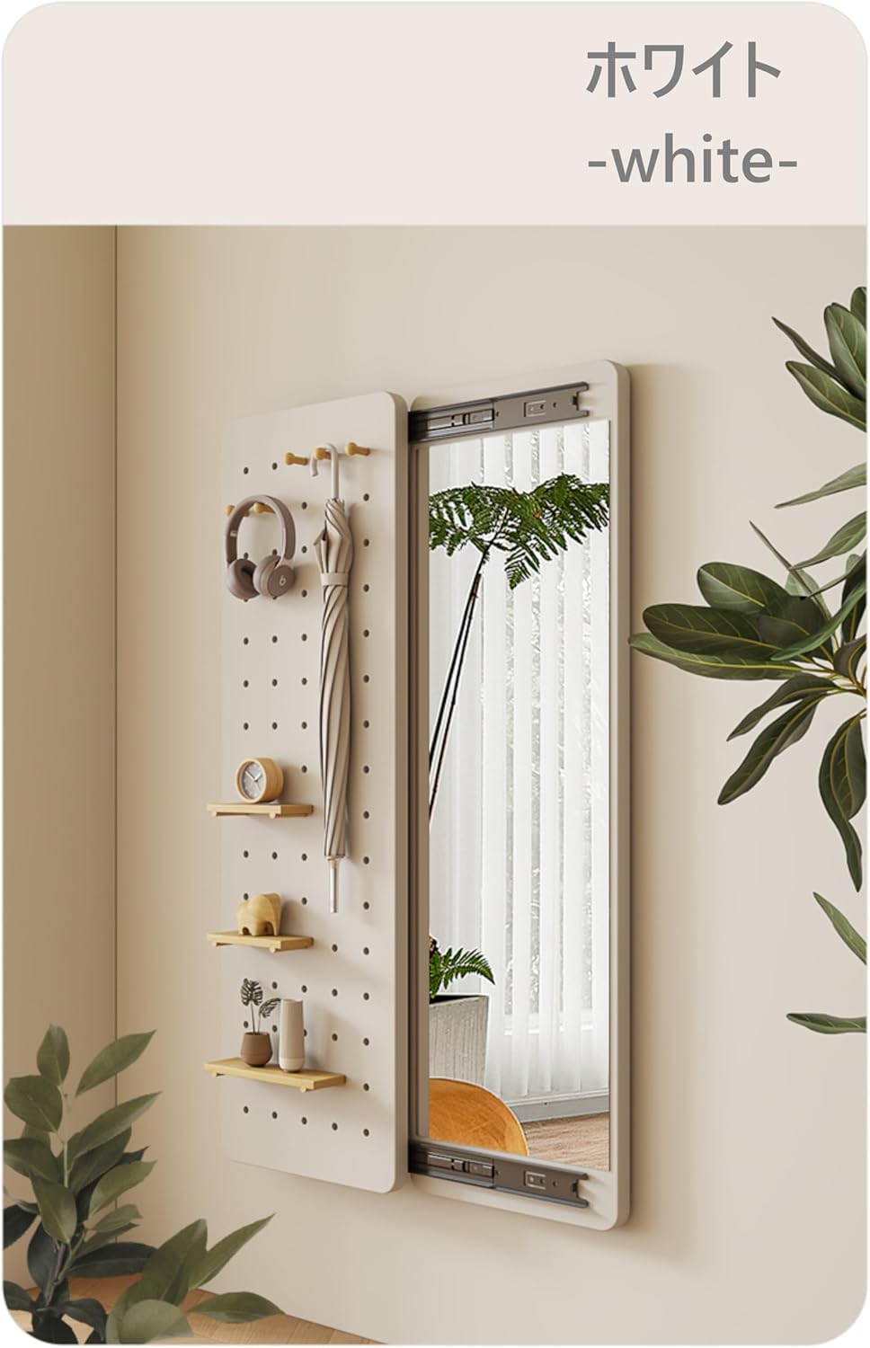 玄関 寝室 姿見鏡 全身 おしゃれ 収納ボード付き ミラーが隠せる 有孔ボード ペグボード飛散防止加工 インスタ映え 木製 収納 スライドして隠す 飛散防止加工 スリム ロング ミラー 鏡 薄型 40*120cm ホワイト