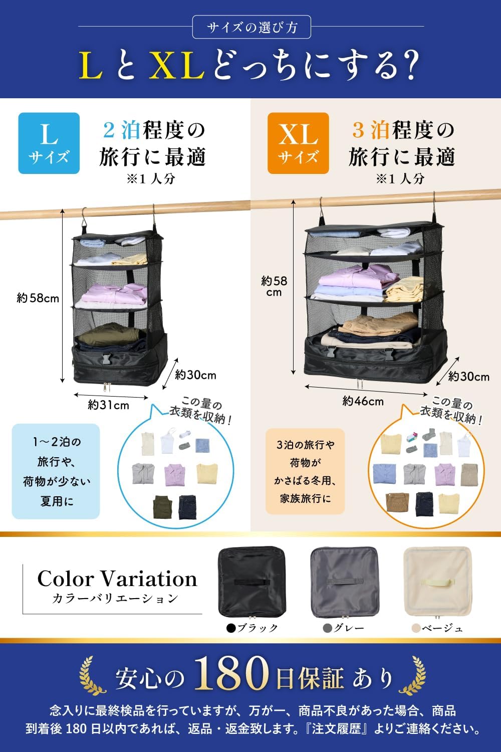 吊り下げ YKK クローゼット 収納 旅行 便利グッズ トラベルグッズ 圧縮袋 [LEAGOO] (ベージュ, L)