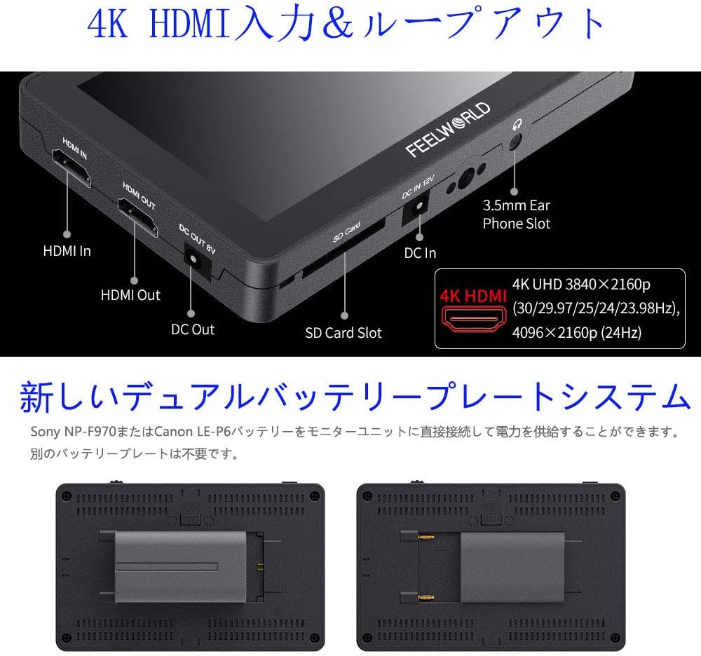 FEELWORLD F6 Plus V2 +NP-F750バッテリ+カメラビデオ モニター タッチスクリーン 6インチ 4K
