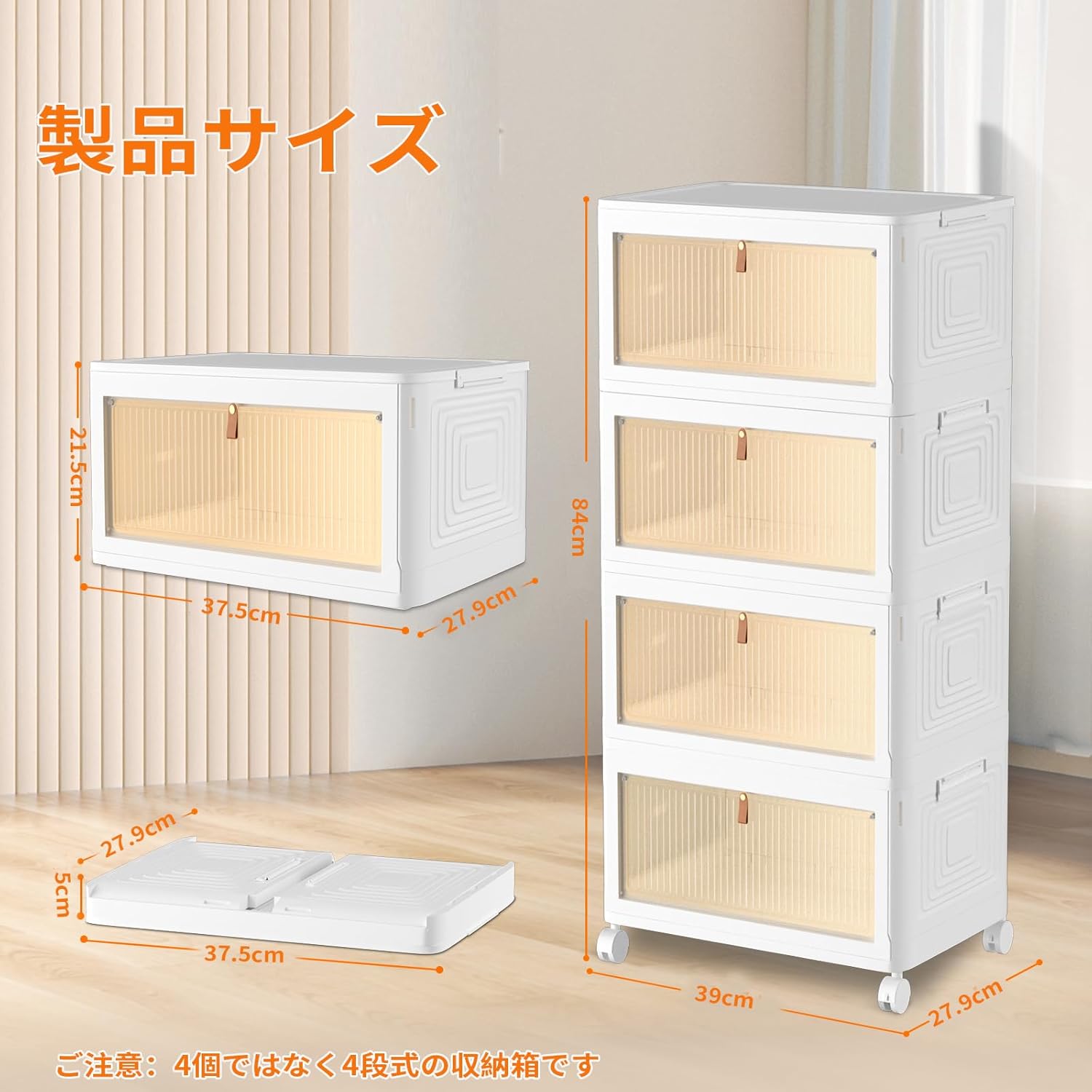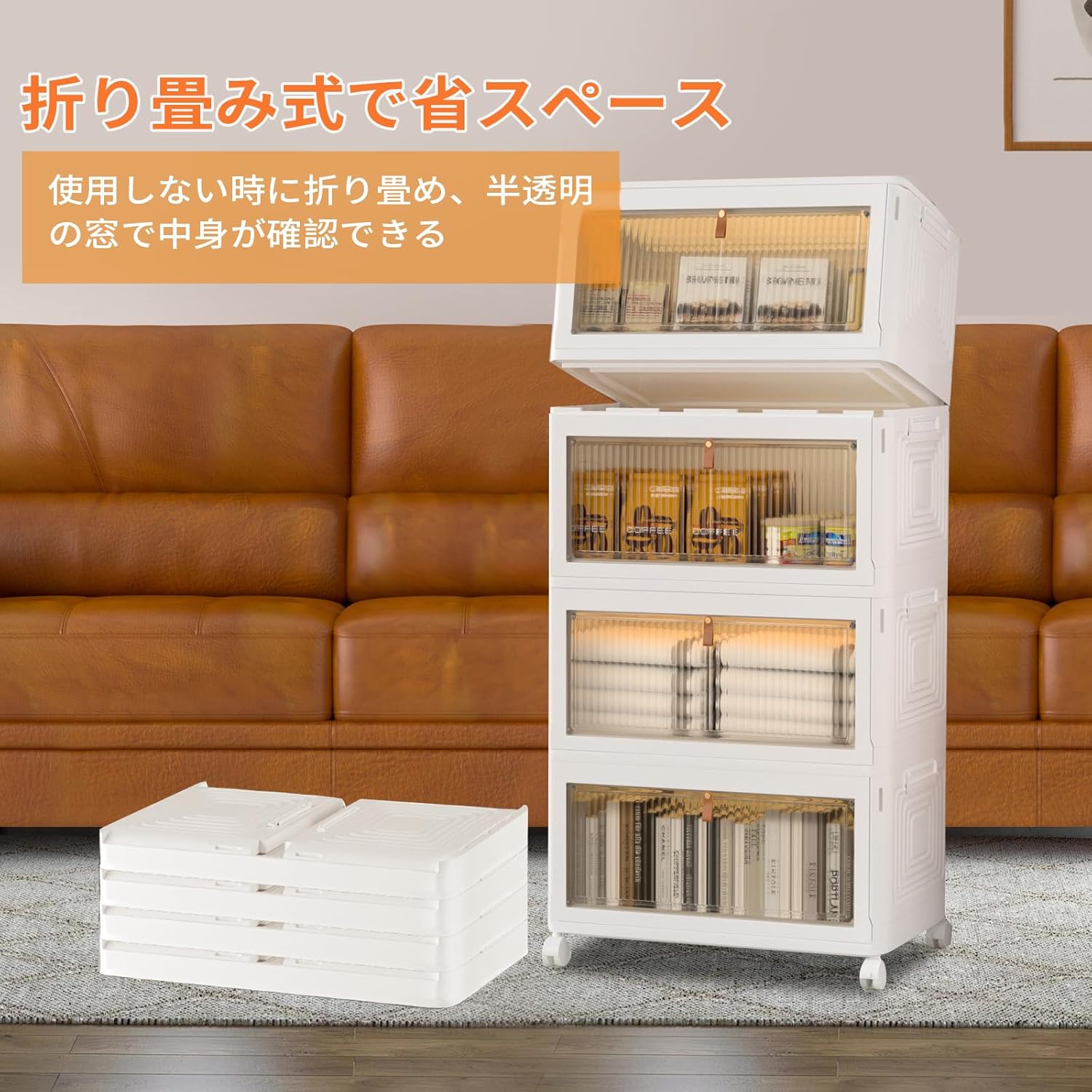 折り畳み収納ボックス 前開き 蓋付き 収納ケース マグネット式扉 キャスター付き 組立簡単 透明 おしゃれ 小物/衣類/書類/化粧品/靴 省スペース 防塵 防湿 無臭 多機能 強い耐荷重 家庭用 4段式 一体型 (39cm*27.9cm*84cm,91.4L)
